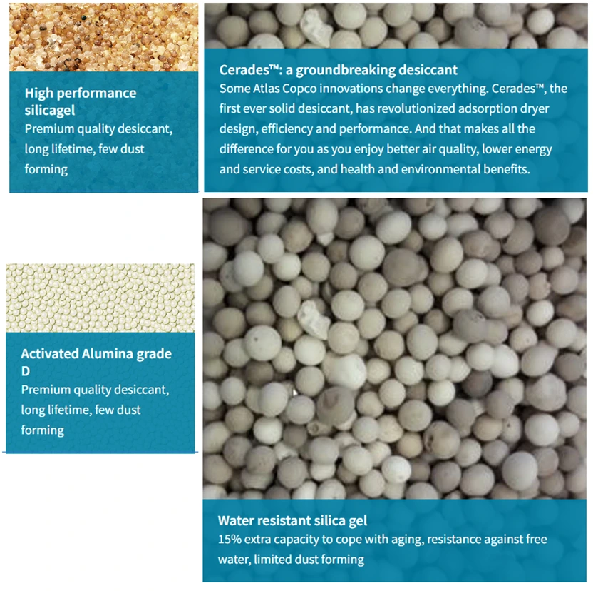 চাপের শিশির বিন্দুর উপর নির্ভর করে, ডেসিক্যান্টগুলি অ্যালুমিনা, সিলিকা জেল বা আণবিক চালনী উপকরণ দিয়ে তৈরি করা যেতে পারে। ন্যূনতম চাপ শিশির বিন্দু -70℃ পৌঁছতে পারে.