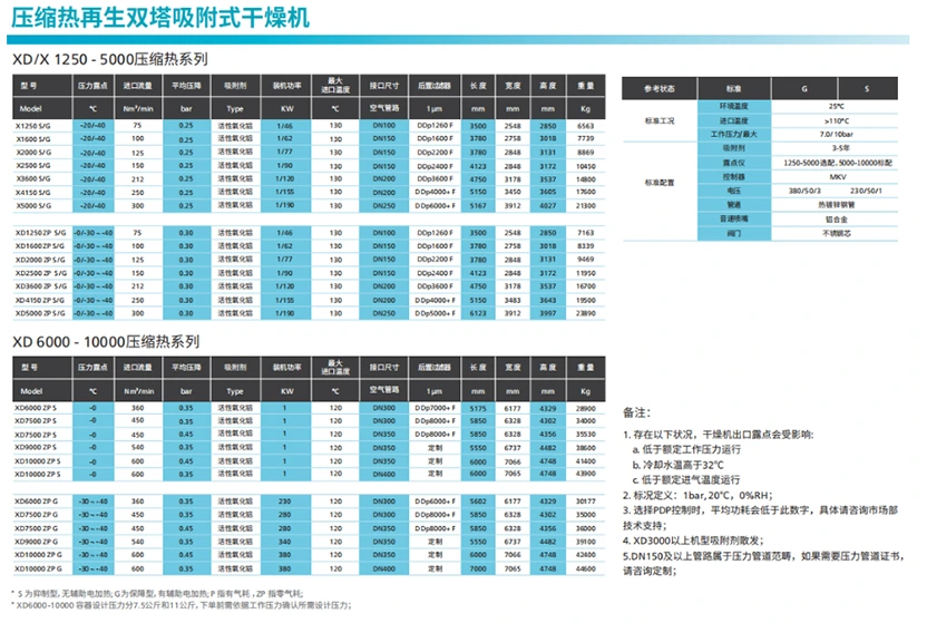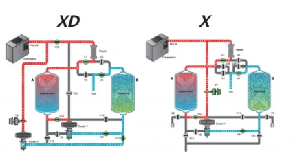 XD বা X কম্প্রেশন তাপ শোষণ ড্রায়ারগুলি উচ্চ-মানের শোষণকারী ব্যবহার করে এবং তেল-মুক্ত কম্প্রেসার থেকে কম্প্রেশনের তাপকে দক্ষতার সাথে ব্যবহার করে শোষণকারীকে পুনরুত্পাদন করে, উল্লেখযোগ্যভাবে শক্তি খরচ এবং রক্ষণাবেক্ষণ খরচ হ্রাস করে।