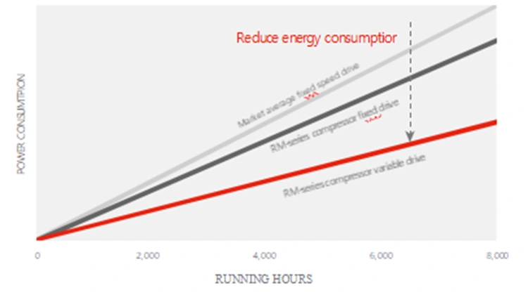 প্রতিটি RM সিরিজের এয়ার কম্প্রেসার একটি একেবারে নতুন, উচ্চ-দক্ষ প্রধান ইউনিট দিয়ে সজ্জিত, একটি IE3 ফিক্সড-স্পীড মোটর এবং ECO*-PM VSD IE5 ভেরিয়েবল-ফ্রিকোয়েন্সি মোটর প্রযুক্তির সমন্বয় করে, যা আপনাকে শক্তি খরচে 12-30% পর্যন্ত সাশ্রয় করতে সাহায্য করে।