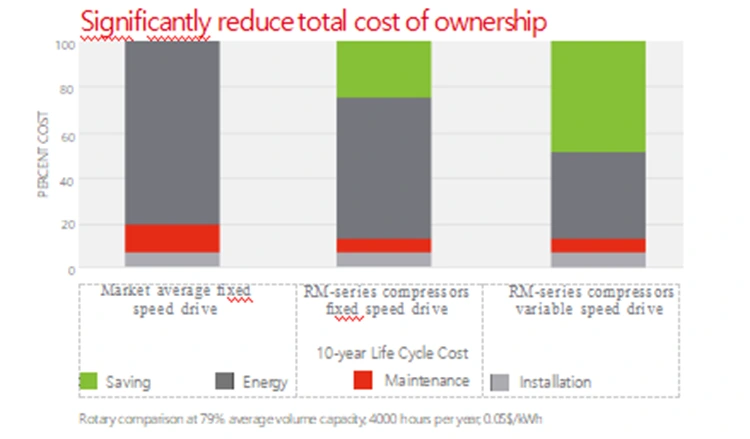 আমরা অত্যাধুনিক কম্প্রেসার ইউনিট ব্যবহার করে নতুন RM সিরিজ তৈরি করেছি, যা আপনাকে উন্নত কর্মক্ষমতা প্রদানের জন্য ডিজাইন করা হয়েছে। অপ্টিমাইজ করা রটার প্রোফাইল এবং অন্যান্য উন্নতির মাধ্যমে, নতুন কম্প্রেসার ইউনিট দক্ষতায় 11% বৃদ্ধি এবং অপারেটিং খরচে উল্লেখযোগ্য হ্রাস অর্জন করে। উপরন্তু, নতুন রটার প্রোফাইল আদর্শ বায়ু ক্ষমতা অর্জন করে, পূর্ববর্তী প্রজন্মের তুলনায় 11% বেশি। কম পাওয়ার-টু-ওয়েট অনুপাত মানে কম সরঞ্জাম বিনিয়োগ খরচ এবং শক্তি খরচ, এইভাবে আপনার মালিকানার মোট খরচ কমিয়ে দেয়।